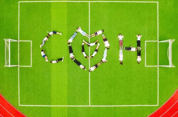 支教队员们在小学操场摆出“春晖”的标志:“CH” ,图源春晖支教队员
