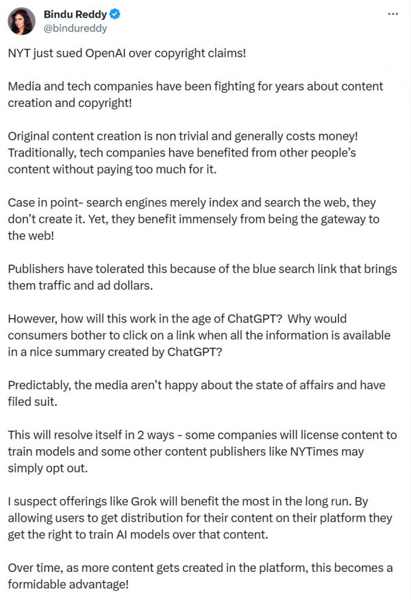 Abacus.AI CEO Bindu Reddy 发文表示,或许最后获益最大的是像 Gork 这样的产品。毕竟,通过允许用户在其平台上发布内容,他们就能获得用这些内容训练人工智能模型的权利。