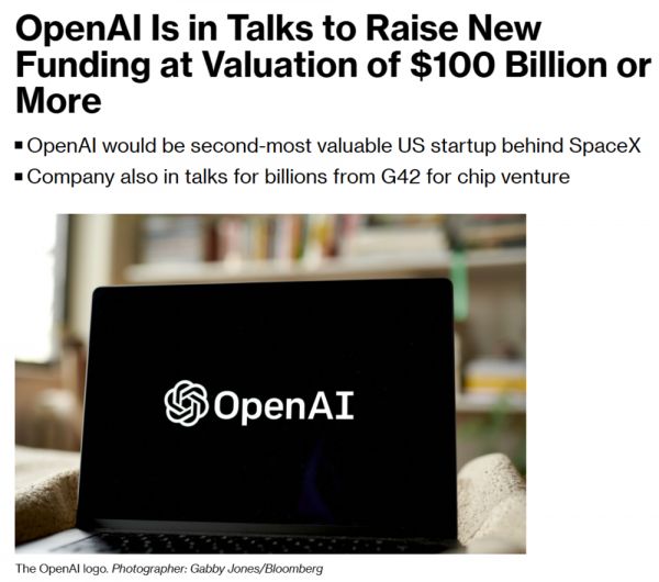据彭博社上周报道,OpenAI 目前正在与投资者洽谈新一轮融资,估值将达到 1000 亿美元,这将使其成为美国估值第二高的初创企业。