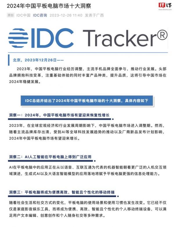 IT之家 12 月 28 日消息,IDC 今天对 2024 年中国大陆平板电脑市场进行预测,认为明年相关市场有望迎来“恢复性增长”,预计呈现“尺寸两极化发展”、“价格性能均上升”、“融合 AIGC 特性”三项趋势。