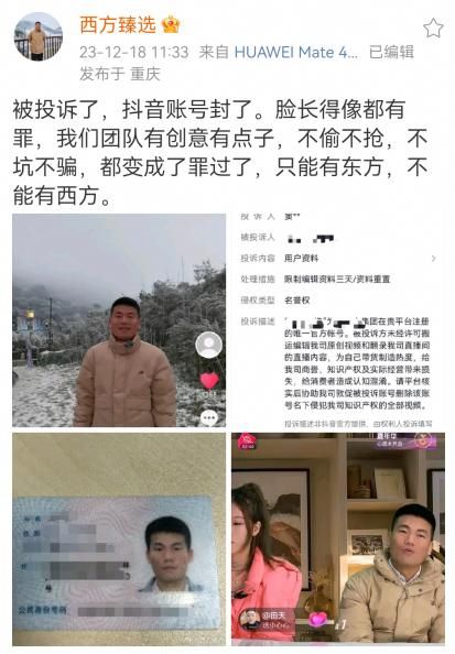 西方臻选则注册微博账号,直言被东方甄选举报,还晒出身份证,“脸长得像都有罪,我们团队有创意有点子,不偷不抢,不坑不骗,都变成了罪过了,只能有东方不能有西方”。