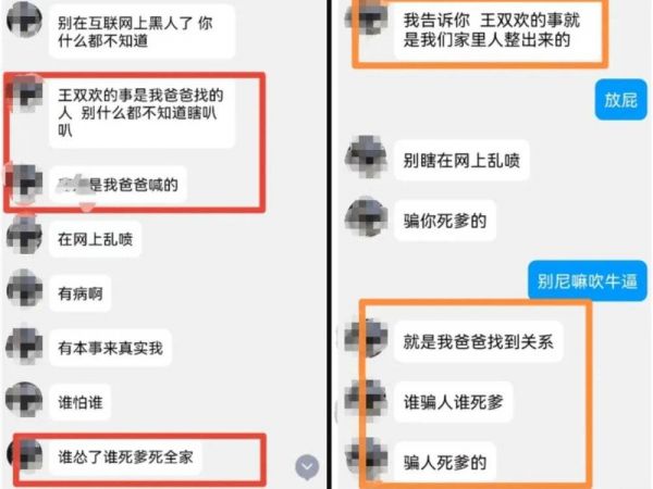 其他同学提供的非完整版聊天记录还包括,孙秋雨在QQ上说,“王双欢的事是我爸爸找的人,别什么都不知道瞎叭叭”“有本事了来证实我(“真实”,网络用语,“整死”的谐音梗)”“谁怂了谁死爹死全家”“王双欢的事是我们家干的”“你知道个X呀”。