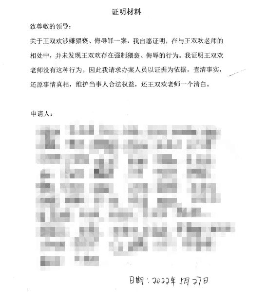 出事后,陆敏趁着去丈夫的学校收拾东西时,把提前打印好的材料通过班长转达,内容是:“在与王双欢老师的相处中,并未发现王双欢存在强制猥亵、侮辱等行为”。这份材料获得了55位同学的签名,其中一位是该案证人。她曾告诉办案机关“听说经常跟女生动手动脚”,可又在《证明材料》中签了字,证明王欢欢没做这样的事。另有7名老师也在类似材料上签了字。