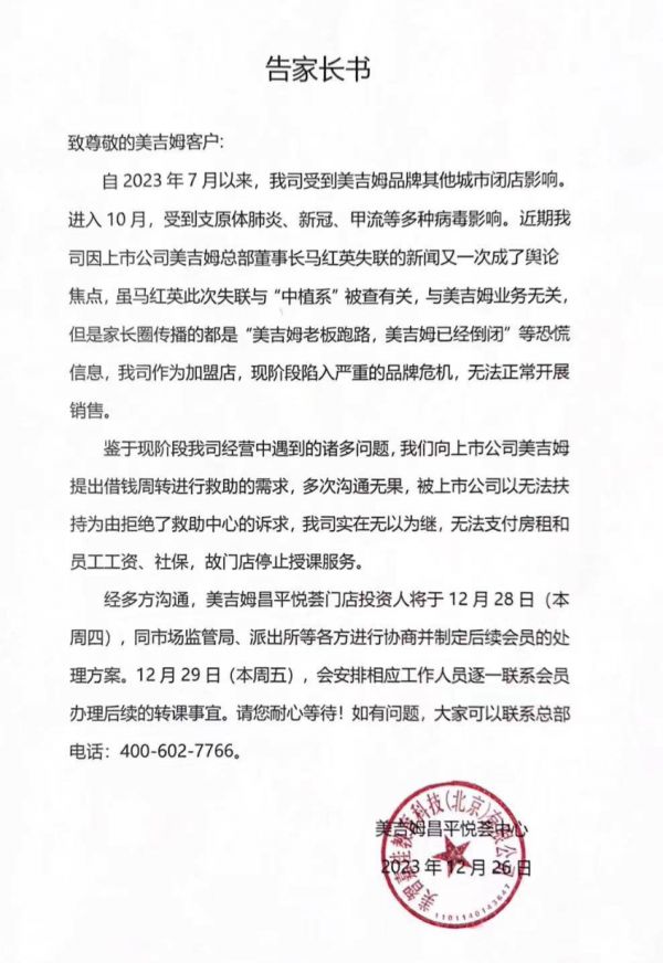 紧接着,26日,美吉姆北京西直门店贴出告示称因“员工内部问题”停课,其员工对家长表示“后续情况不确定”。