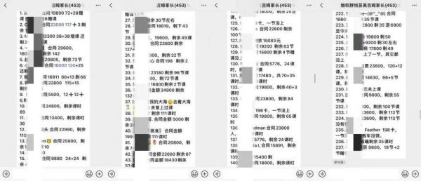 没有得到任何解释的家长们开始在社交媒体平台相互通知,自发建立微信群聊统计损失。仅在美吉姆昌平悦荟一家门店的统计群里就能看出,家长们未使用的课时费用大多价值过万。截至12月28日下午,已有近250余位家长参与了损失统计。