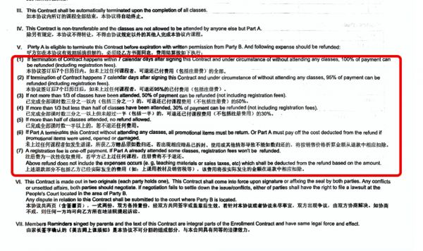 但根据王女士买课时和美吉姆门店签订的合同显示,退费并不容易。比如在当时签订的合同中就规定,“已完成全部课时一半以上的,不退还任何费用”,12月28日下午4点左右,一些家长反馈,自己的美吉姆账户在闭店后仍在计算课时,这将会进一步影响他们的退、转课权益。