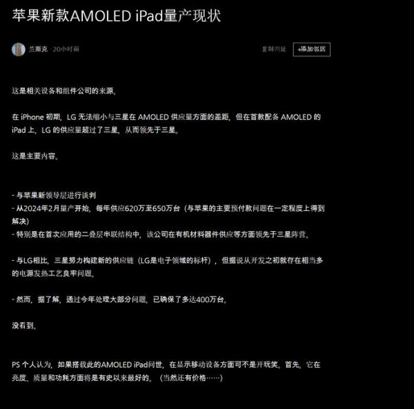 (图源Naver 已用谷歌翻译)苹果从LED转向OLED并非出人意料。在科技领域,追求更薄、更亮、更鲜活的屏幕已经成为一种趋势。OLED的自发光和轻薄的特性正好满足了这一追求。虽然LED面板的iPad Pro已经足够出色,但苹果作为一个总是寻求创新的公司,选择OLED几乎是必然的一步。