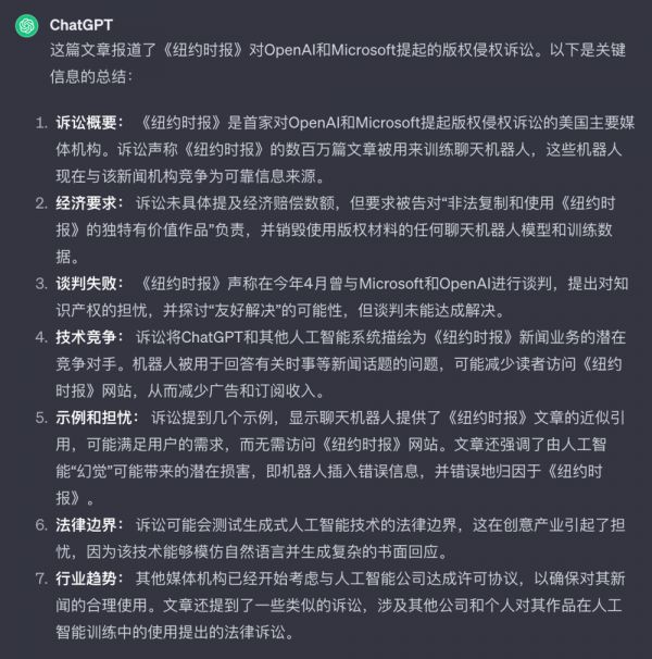 作为媒体,它最大的资产就是多年积累下来的几百万篇文章,但 OpenAI 和微软拿这笔宝贵的数字资产训练 AI,让 AI 实现“准确复述时报内容、紧密概括原文,并模仿其独特的表达风格”的功能,损害了它和读者之间的关系。
