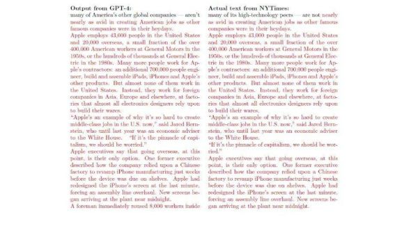 下面这张图更加直观,左边是 GPT-4 生成的内容,右图是《纽约时报》的原文,红色标记的部分是完全一样的内容。