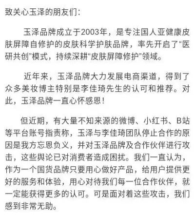 这样的攻击几乎持续一年时间,玉泽2021年在一份声明中称,大量微博、小红书、B站用户指责玉泽“忘恩负义”地停止了和李佳琦团队的合作,并对玉泽品牌及合作伙伴进行攻击,对消费者造成困扰。