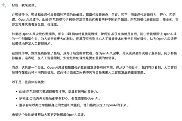 我们也尝试让谷歌 Bard 总结这场大戏并与《甄嬛传》进行类比,它给出了这样的介绍。