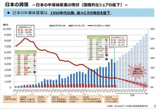上世纪80年代曾是日本半导体产业极为辉煌的时代,其时在全球的半导体产业中,日本占据了半壁江山以上,前十大企业有6家是日本的,前四名被日本囊括,例如1988年日本就占到全球半导体产值的50.3%。但由于遭到美国的无情打压以及日本本身的战略失误,此后日本半导体产业一蹶不振,一路下滑,目前在全球十大半导体企业中日本全军覆没,日本半导体产业占全球比重不到10%。如今台积电和三星的3纳米芯片早已进入量产阶段,但日本却还在40纳米阶段艰难爬坡。