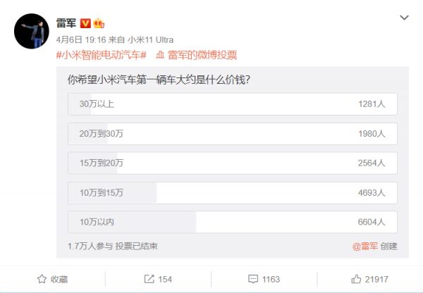 2021年4月,小米官宣造车之后,雷军曾经在自己的微博上发起过一次对小米汽车价格预期的投票,当时的结果如下。
