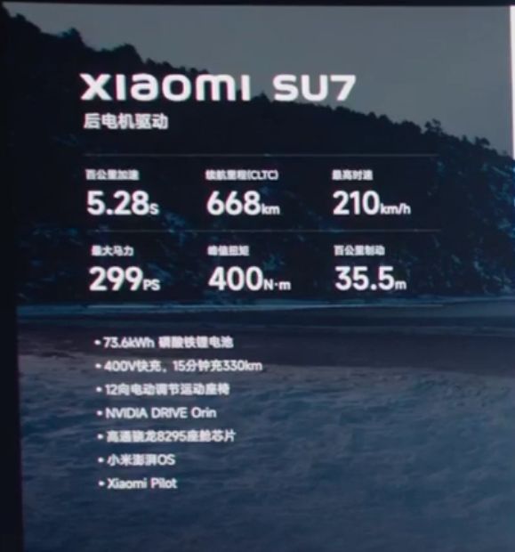 单电机后轮驱动,最大功率220千瓦,400V架构,百公里加速5.28秒,73.6度磷酸铁锂电池,标称续航668公里,没有标注配备激光雷达,这个配置保留了市场对于低价小米汽车的希望。