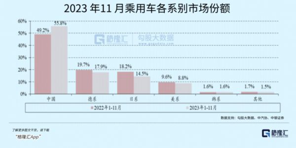 过去三年里,外资车企在国内的市占率有所下降。日系市场份额从2020年的24.1%下降到2023年上半年的17.6%,降幅高达6.5%;德系车的市占率已经跌落20%。取而代之的是国内自主品牌,份额已经跨过50%的分水岭。