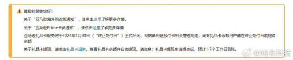 ③亚马逊礼品卡服务将于2024年1月30日正式关闭,根据单用途预付卡相关管理规定,尚有礼品卡余额用户请在终止兑付日前提取余额。