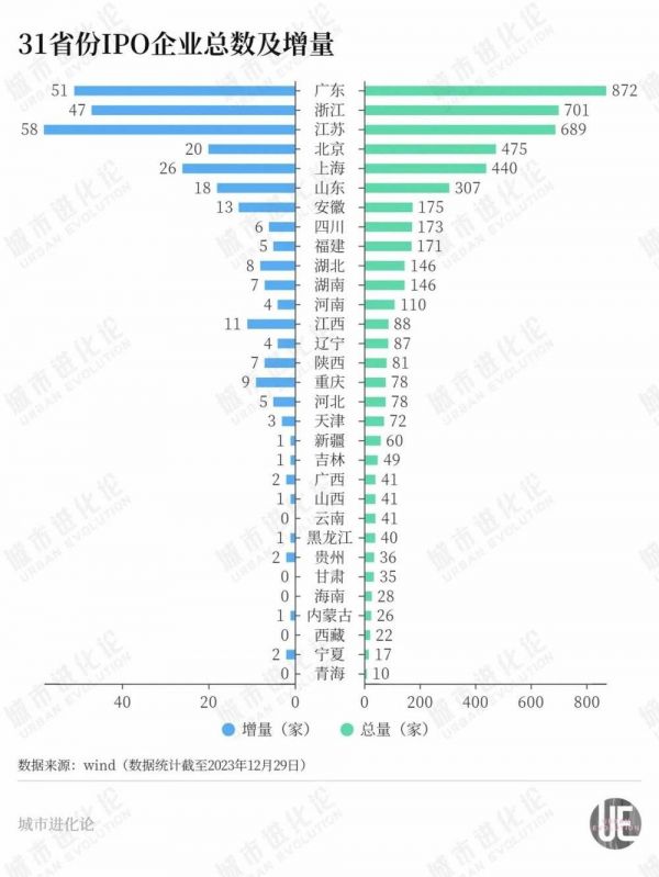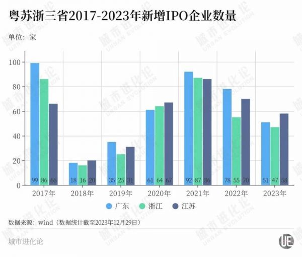 与2022年相比,A股市场三个“龙头”省份的增量几乎打了个“对折”。2023年,广东新增51家、江苏新增58家、浙江新增47家。