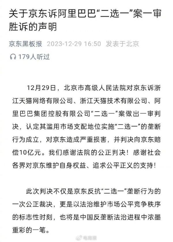 “二选一”案宣判,阿里败诉向京东赔偿10亿元