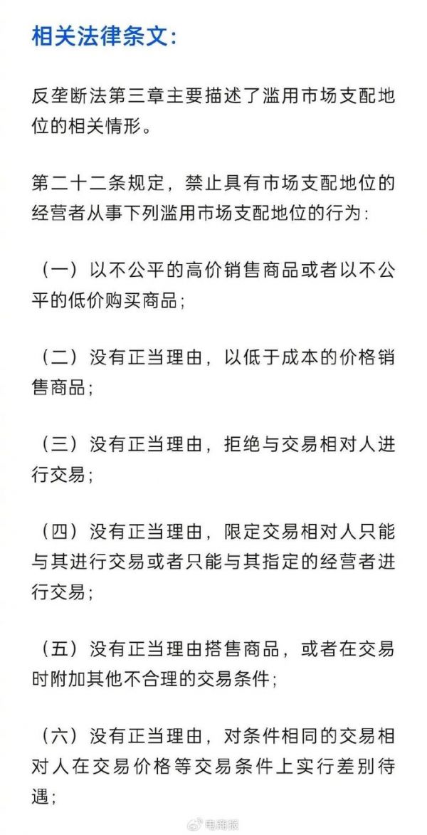 这种“人无我有”的独家协议,就成了吸引消费者、获取更多市场份额和竞争优势的有效举措。单独从竞争策略的效果来看,“二选一”无疑是十分高效的但是从另一个角度来看,这类限制商家自由选择权的策略,却很有可能涉嫌违反《反不正当竞争法》、《电子商务法》等相关法律法规,破坏公平竞争的市场环境。国家市场监督管理总局的通报将“二选一”的行为直接定义为“垄断行为”。