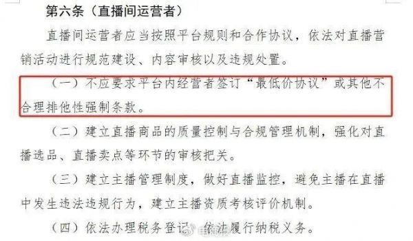 2023年12月,上海市市场监督管理局新修订的《上海市网络直播营销活动合规指引》第六条(一)明确指出:不应要求平台内经营者签订“最低价协议”或其他不合理排他性强制条款。