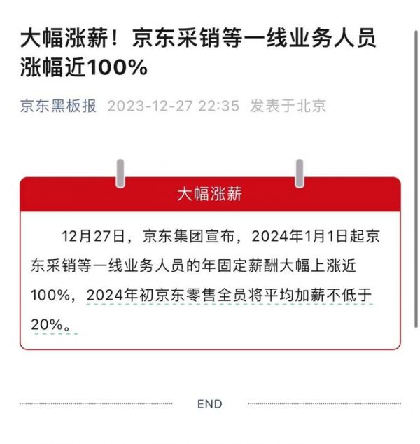 12月27日晚,京东集团发布消息,2024年1月1日起京东采销等一线业务人员的年固定薪酬大幅上涨近100%,2024年初京东零售全员将平均加薪不低于20%。