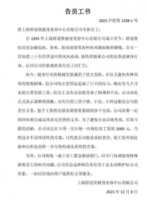 而网上流传的一份上海舒适堡健身美容中心有限公司发布的《告员工书》则显示,舒适堡方面称健身行业发展遇到较大危机,叠加各种突发的客观困难,给公司的正常运营造成了巨大压力,几个月未能正常发放工资,公司决定于12月11日先行统一向每位员工发放2000元。“当然这并不是终结性的方案,只代表公司愿意承担责任,除工资外的社保和公积金也将一并尽快形成实质性的方案。”