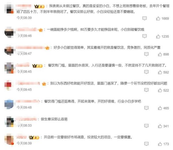 对此,网友纷纷表示,餐饮业门槛还挺高的,开好餐馆不容易。还有网友分享了自己亲戚开餐馆失败的案例。
