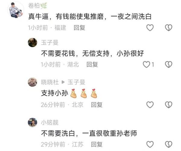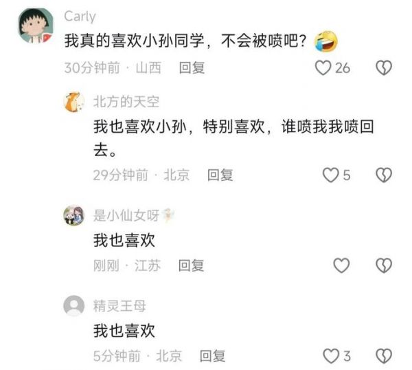 有网友表示,我真的喜欢小孙同学,不会被喷吧?在这个网友的评论下面,有很多网友跟帖,纷纷表示喜欢小孙,谁要是喷我,我就喷回去。