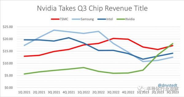 英伟达今日在一份公布的芯片行业收入评估中,从第四位跃升至第一位。台北的金融分析师Dan Nystedt指出,在第三季度财务报告公布之际,英伟达从芯片制造巨头台积电手中夺走了收入冠军。