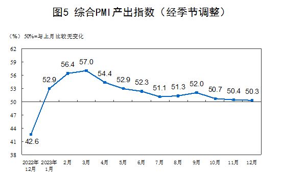 12月份,综合PMI产出指数为50.3%,比上月下降0.1个百分点,高于临界点,表明我国企业生产经营活动总体保持扩张。