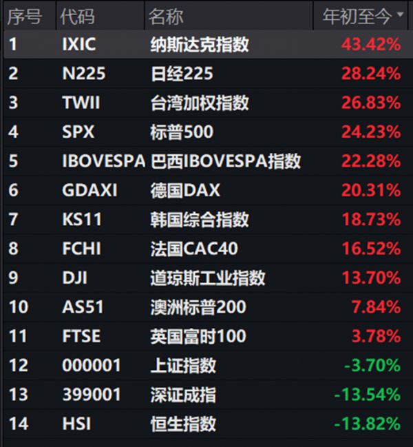 Wind(万得)数据显示,2023年,在全球14只重要资本市场指数中,恒生指数全年以13.82%的跌幅位列倒数第一;位列倒数第二的是深证成指,全年下跌13.54%;上证指数居倒数第三,全年下跌3.70%。