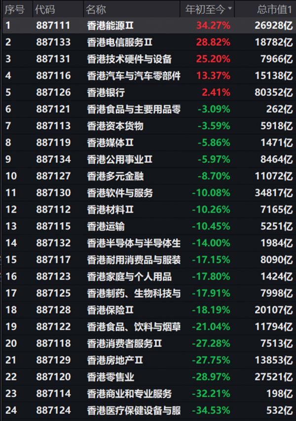 (Wind香港二级行业指数年初至今表现)