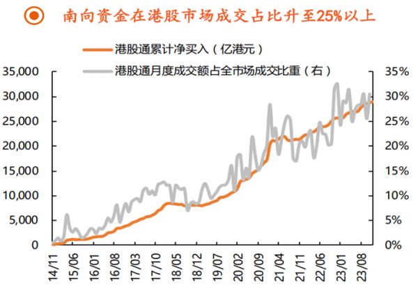 平安证券的研究显示,南向资金的交易力量近年逐渐抬升,2023年南向资金在月度成交中占比平均在28%左右。