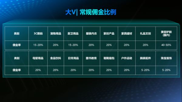 从理性的角度计算,AI平台内部没有广告,参考目前大V主播的佣金比例(不同品类不等,见下图),其GMV平均货币化率会超过15%,甚至更高。而2022年淘宝和拼多多的货币化率为4%左右。