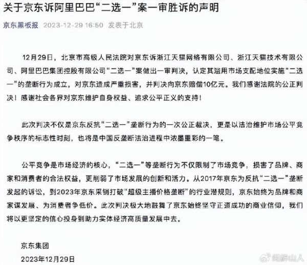 京东官方表示,对一审判决感到欣慰,认为这是对平台经济领域反垄断的有力推动,也是对平台内商家和消费者权益的有力保障。京东将继续坚持公平、开放、合作的平台理念,为商家和消费者提供优质的服务,为平台经济的健康发展贡献力量。