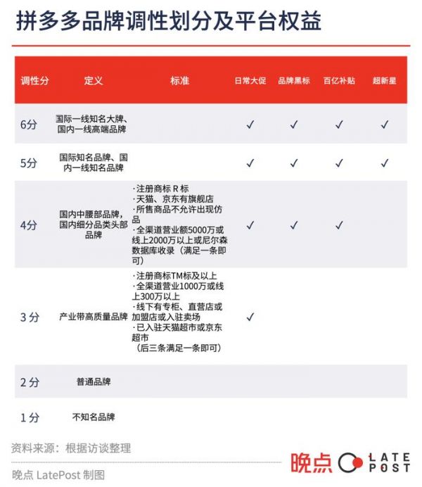 在拼多多内部,平台流通的所有商品通常被划分为 1 - 6 分六个等级,其中 3 分及以上的品牌可参与日常大促活动报名,获得更多流量和资源支持,4 分及以上品牌可申请品牌黑标及百亿补贴资格,超新星计划的目标是拉到更多 5 - 6 分的品牌入场,丰富拼多多的品牌生态。
