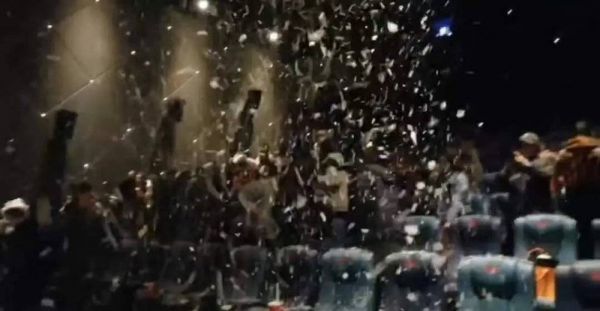 有影院用泡泡机代替造雪机,还有影院自己开发了一套造雪方式,两位工作人员抱着一桶和雪质地很像的物料,朝着观众撒,甚至有影院直接撒纸片。