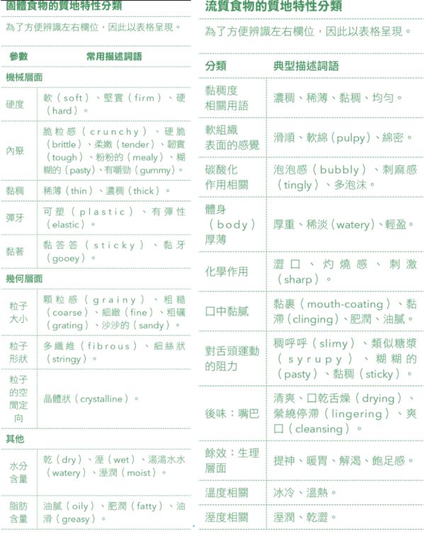 下图出自《口感科学》一书,我们能看到洋人喜欢“愚蠢”地用“科学”的分类归纳及定义方法。比如弹牙,是指食物在受牙齿挤压塑形变形后,在压力去除的情况下食物恢复原状的速率。
