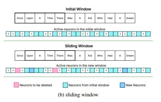 把那些在预测模型中产生正输出的神经元定义为活跃神经元,在内存中保留最近一部分输入标记的神经元数据,仅加载当前输入标记与其直接前驱不同的神经元数据。这样做能有效利用内存,释放掉之前分配给已不在滑动窗口内的旧标记神经元数据的内存。