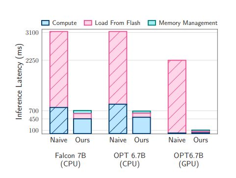 为了证明论文提出方法的实际价值,论文引用了Facebook的OPT 6.7B模型和TII的Falcon 7B模型。下图在模型的一半内存可用时,1个token的推理延迟。在M1 Max上,每个token从闪存加载需要125毫秒的延迟,内存管理需要65毫秒。因此,每个token的总的与内存相关的延迟小于190毫秒(两者总和)。