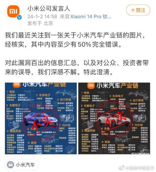 小米称网传小米汽车产业链至少50%错误