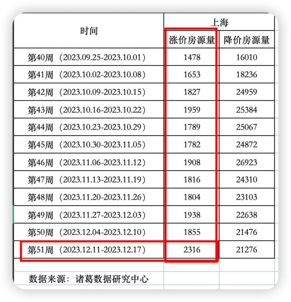 据诸葛数据研究中心统计,12月11日至17日,也就是上海地区政策发布的一周,涨价房源量在近12周内首次突破两千套。