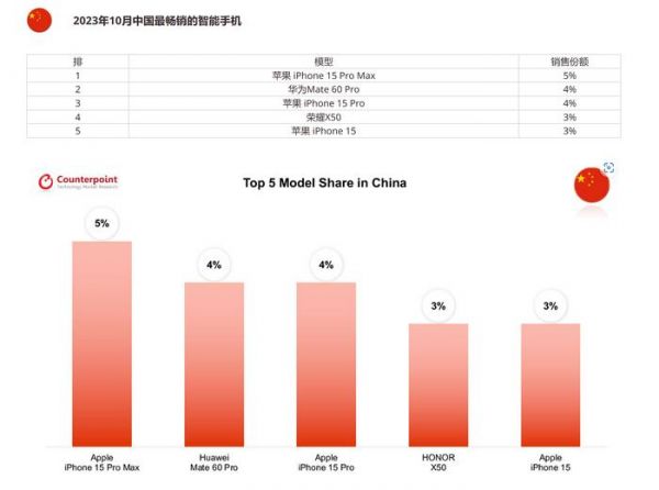 10月中国畅销智能手机榜:苹果iPhone 15 Pro Max登顶