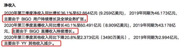 几乎在双方官宣的同一时间点,欢聚发布的三季报也显示,其海外业务已经可以撑起自身的未来:总营收达62.864亿元,其中BIGO收入达33.948亿元,已经占据了过半的收入,而净收入与直播收入的大幅度增长,都得益于BIGO的用户持续增长及直播收入持续增长。