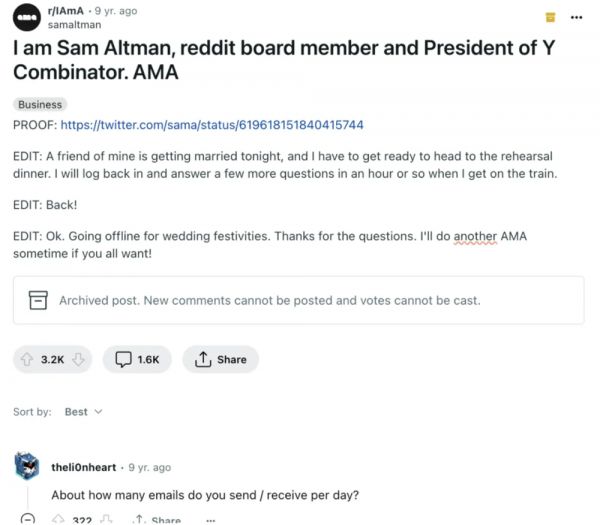 虽然只有八天。但从其中不难嗅出山姆·奥特曼本人与 Reddit 的暧昧关系:奥特曼本人曾在 Blog 用戏谑的语气写到“虽然我只当了八天 CEO、但在此期间新增的用户数量比 Hacker News 用户总数还多”。他本人也曾以 AMA(Ask me anything,Reddit 社区中流行的一种问答方式)深度参与到 Reddit 的社区文化中,正面回答了不少来自 Reddit 用户的尖锐问题。