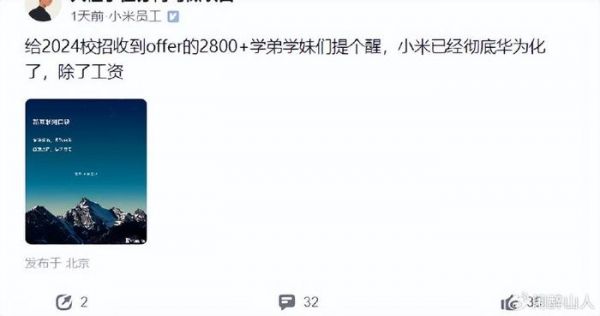 小米,这个曾经被称为“最会营销的互联网公司”的企业,如今已经成为了世界五百强之一,拥有了数以亿计的用户和粉丝。然而,随着小米的发展壮大,它的内部管理和文化也发生了巨大的变化。近日,有小米员工在社交平台上发帖称,给2024校招收到offer的2800+学弟学妹们提个醒,小米已经彻底华为化了,除了工资。