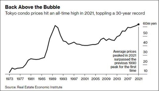 日本东京的房子在泡沫经济破裂后就一路下跌,10年后再缓缓回升,直到2021年才创出新高。