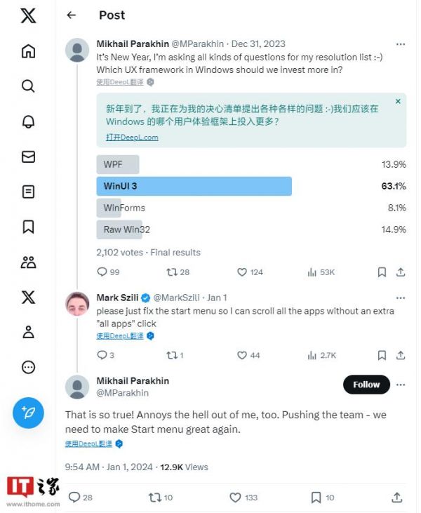 IT之家 1 月 2 日消息,微软广告和网络服务部门首席执行官米哈伊尔・帕拉欣(Mikhail Parakhin)经常在 X 平台与广大网友互动,即便是新年期间也不例外。