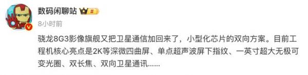 今天,来自同一位博主的最新爆料显示:“骁龙8G3影像旗舰又把卫星通信加回来了,小型化芯片的双向方案。目前工程机核心亮点是2K等深微四曲屏、单点超声波屏下指纹、一英寸超大无极可变光圈、双长焦、双向卫星通讯……”