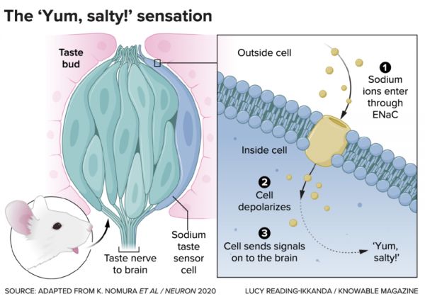 令人愉悦的咸味感觉是由舌头上味蕾中的钠感应细胞检测到的。钠离子通过一种叫做 ENaC的分子,即特殊钠通道进入这些细胞。细胞内正电荷钠离子的涌入,会导致味觉细胞兴奋(或叫做去极化),由此向大脑发出神经信号。—Nomura K, Nakanishi M, Ishidate F, Iwata K, Taruno A. All-Electrical Ca2+-Independent Signal Transduction Mediates Attractive Sodium Taste in Taste Buds. Neuron. 2020 Jun 3;106(5):816-829.e6. doi: 10.1016/j.neuron.2020.03.006.